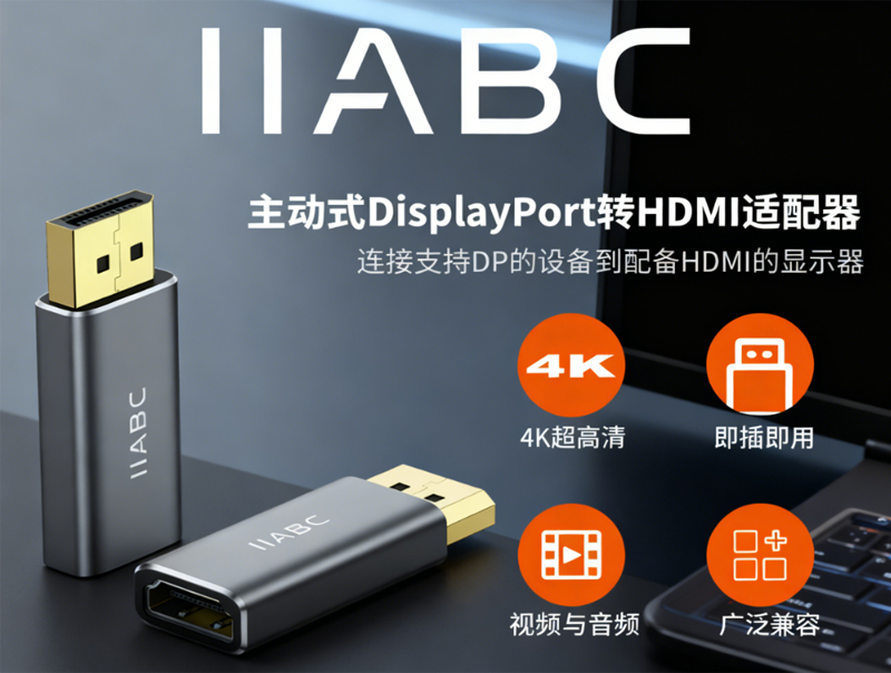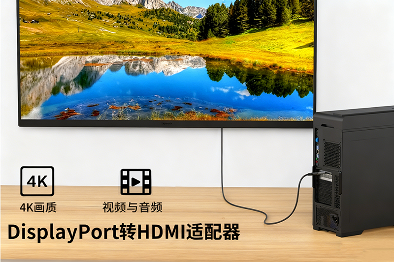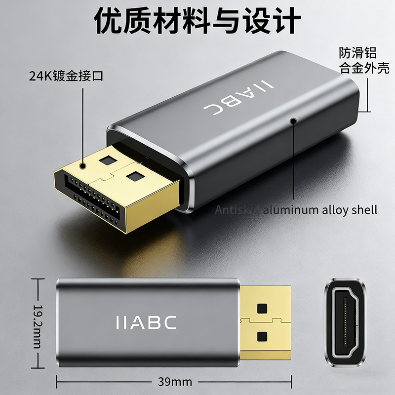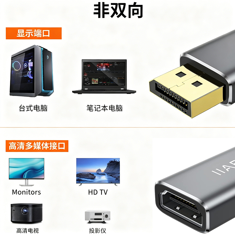 2、跨接口无缝兼容:DP 公头转 HDMI 母头设计,完美适配 “DP 接口设备(笔记本 / 显卡)+ HDMI 显示终端(电视 / 投影)” 的组合,旧显示设备也能复用新主机;