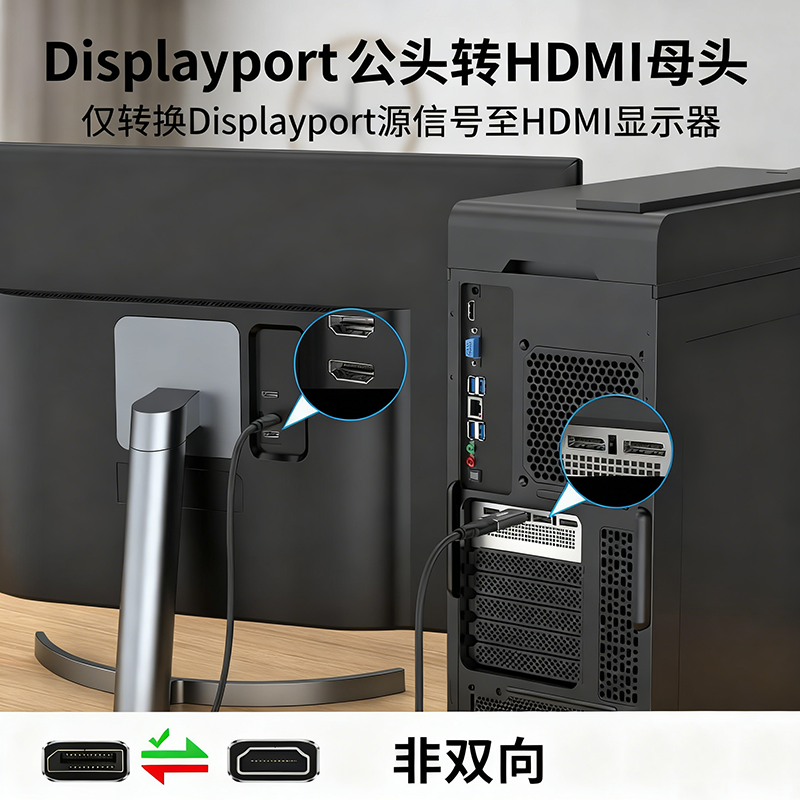 注意:它不是双向转换器,无法将信号从 HDMI 传输到 DisplayPort。