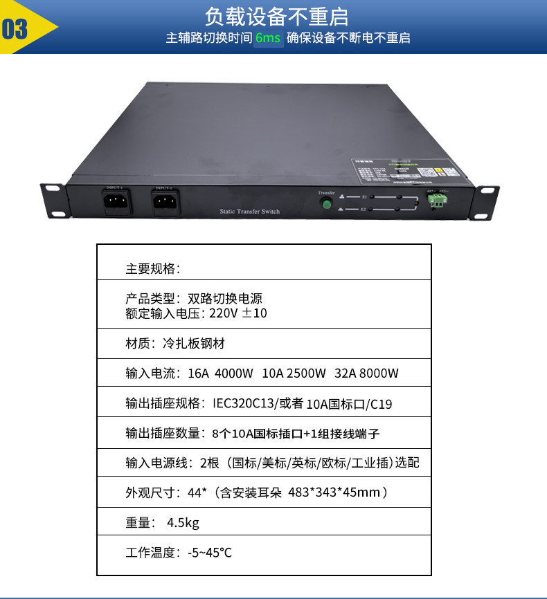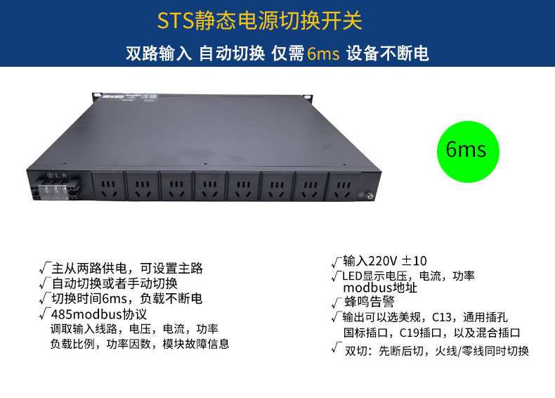双路输入静态切换开关STS自动电源切换市电UPS配电单元6ms切换