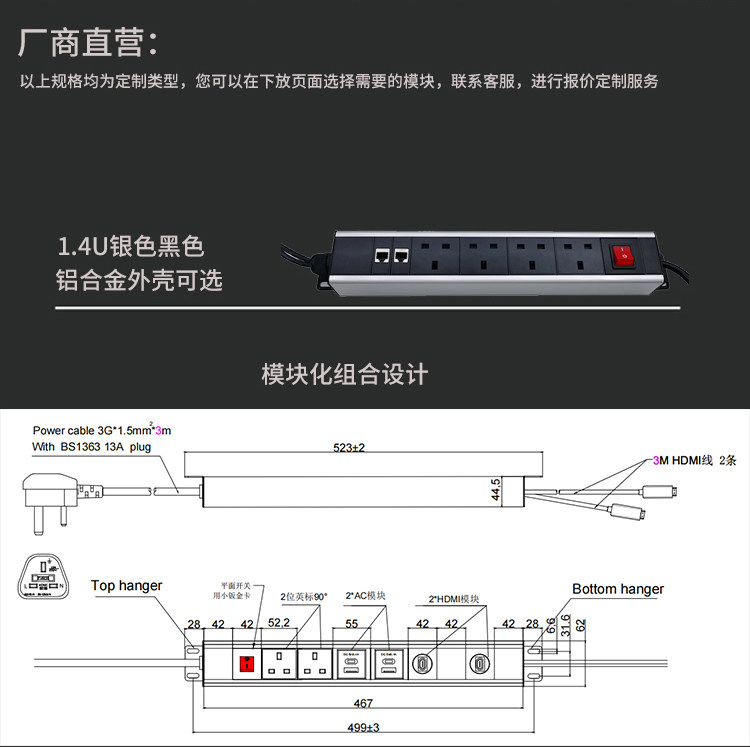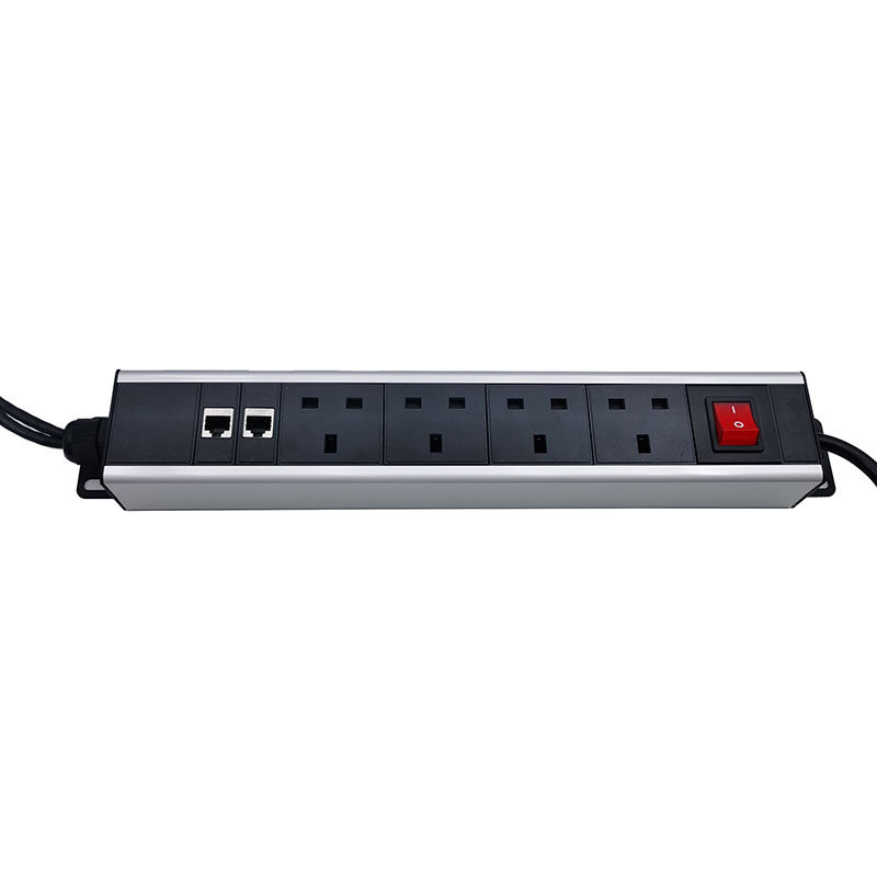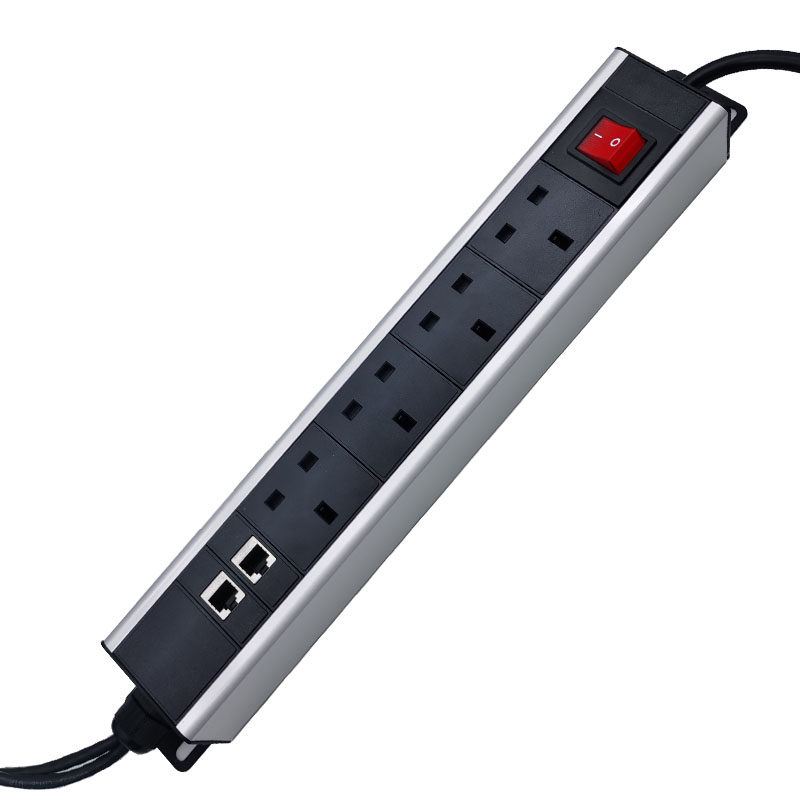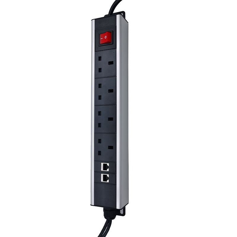 铝合金办公桌面插座13A英规输出4位UK插口2个CAT6网口配 3M网线
