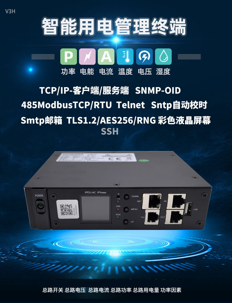 1、TCP/IP-客户端/服务端 SNMP-OID485ModbusTCP/RTU Telnet Sntp自动校时Smtp邮箱 TLS1.2/AES256/RNG 彩色液晶屏幕