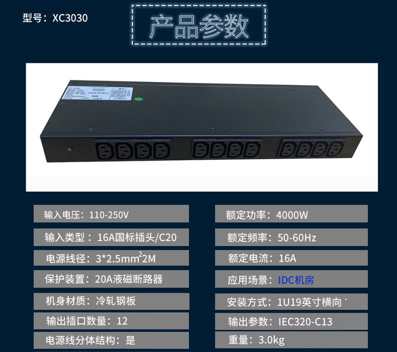 1U机架式16A输入 12位C13输出断路器 钢板机身 PDU电源分配单元