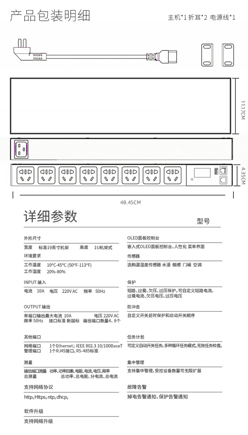 智能PDU插座8位10A 分路开关控制 热拔插指示灯19英寸485协议