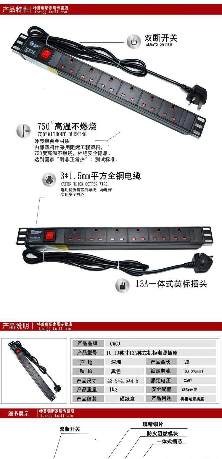 PDU机柜电源插座英规英标13A带双断开关铝合金7位排插接线板
