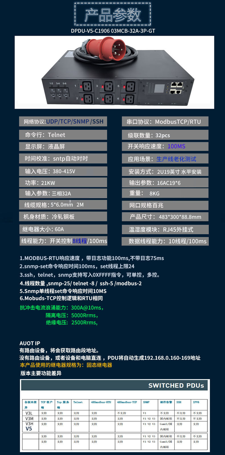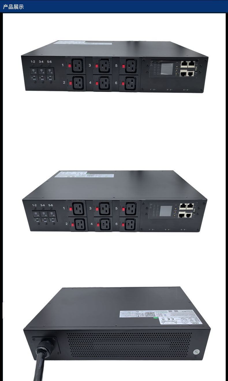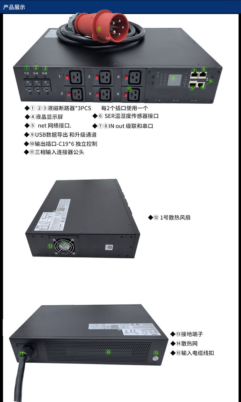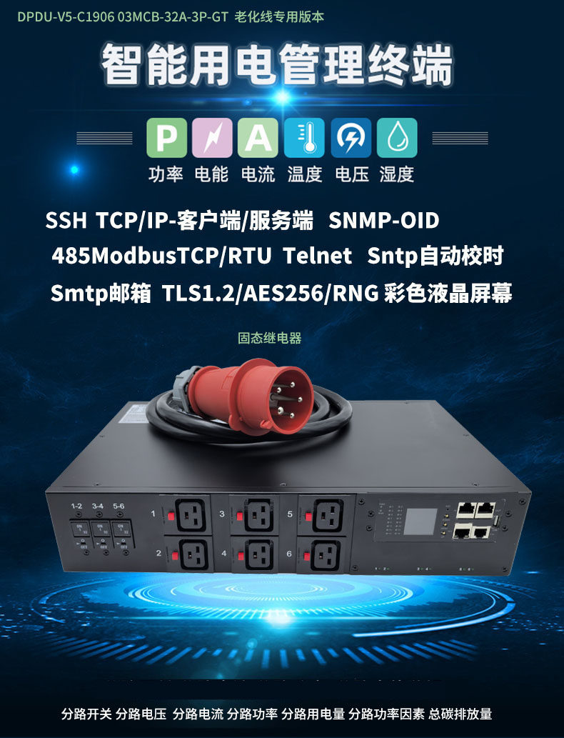 三相380V6位C19智能PDU插座 21KW抗大电流冲击老化测试snmp协议