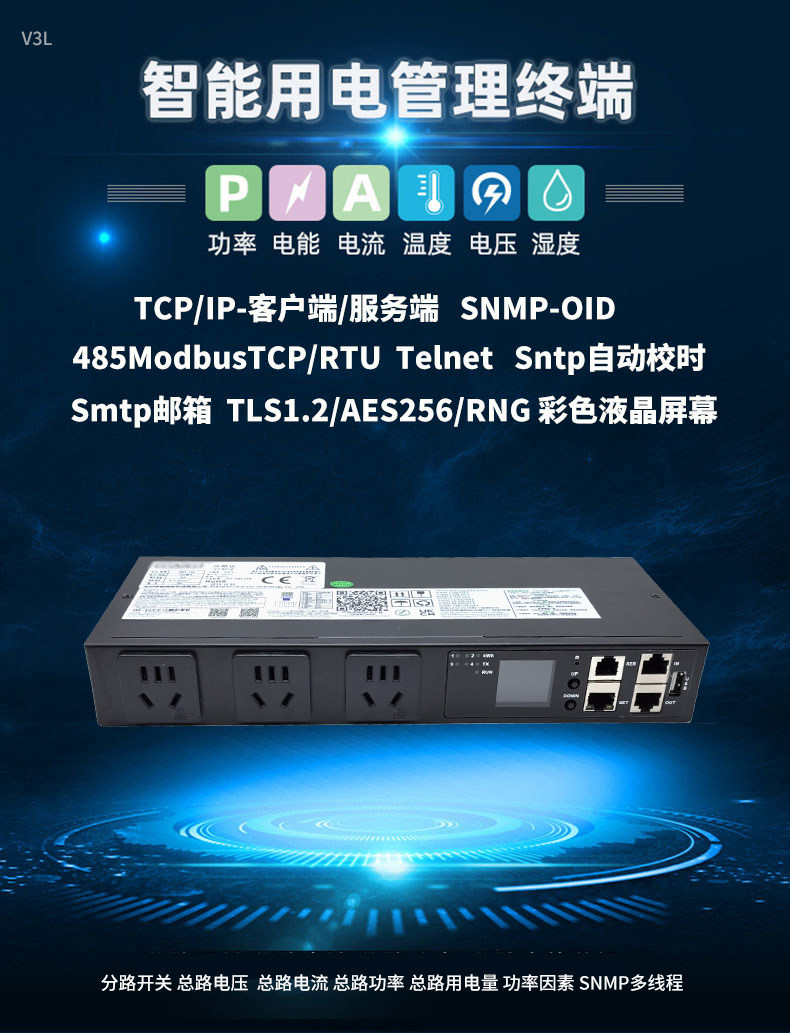 1、TCP/IP-客户端/服务端 SNMP-OID485ModbusTCP/RTU Telnet Sntp自动校时Smtp邮箱 TLS1.2/AES256/RNG 彩色液晶屏幕
