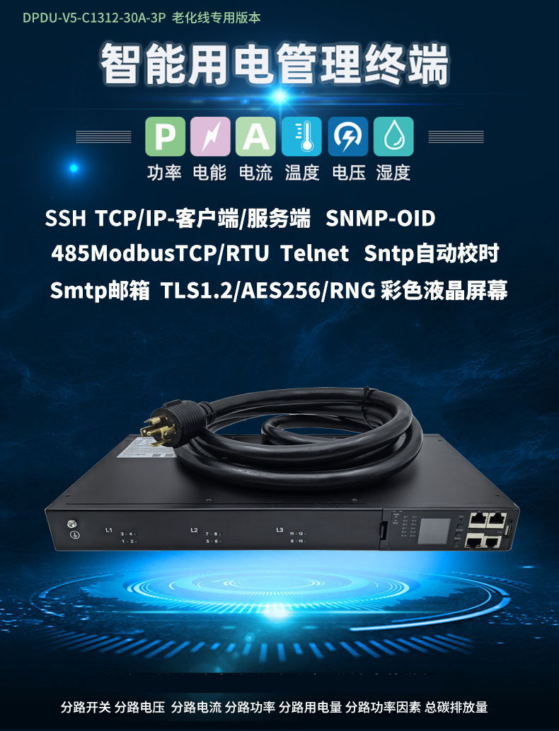 1、SSH TCP/IP-客户端/服务端 SNMP-OID485ModbusTCP/RTU Telnet Sntp自动校时Smtp邮箱 TLS1.2/AES256/RNG 彩色液晶屏幕