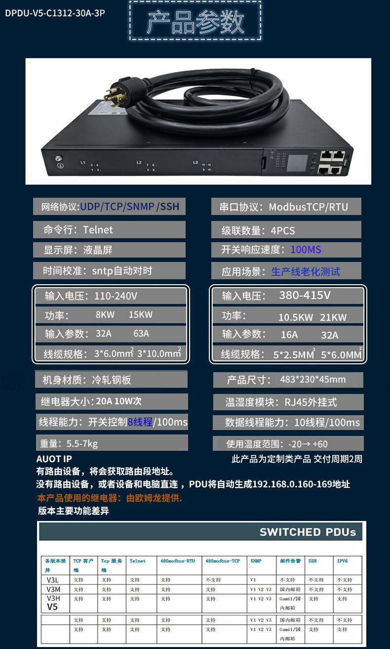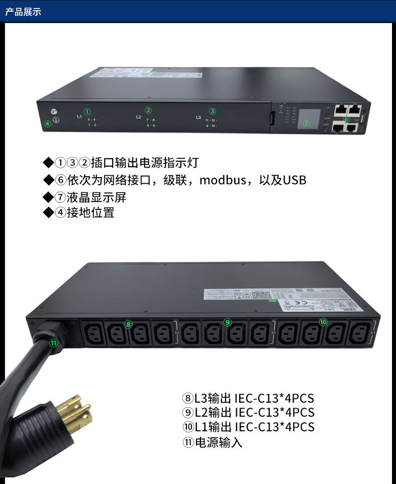 三相380V 12位C13智能PDU插座21KW负载抗大电流冲击老化测试使用