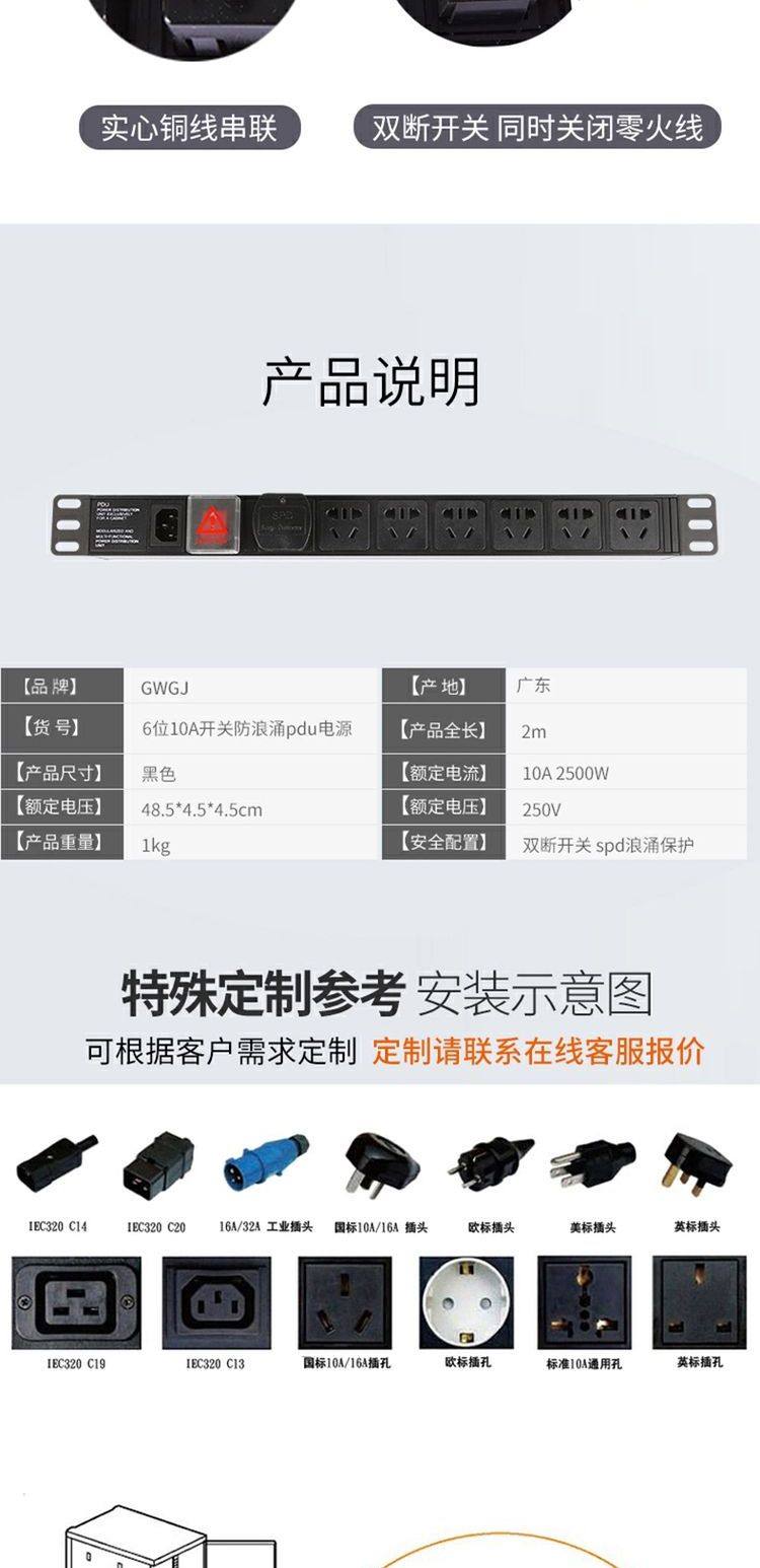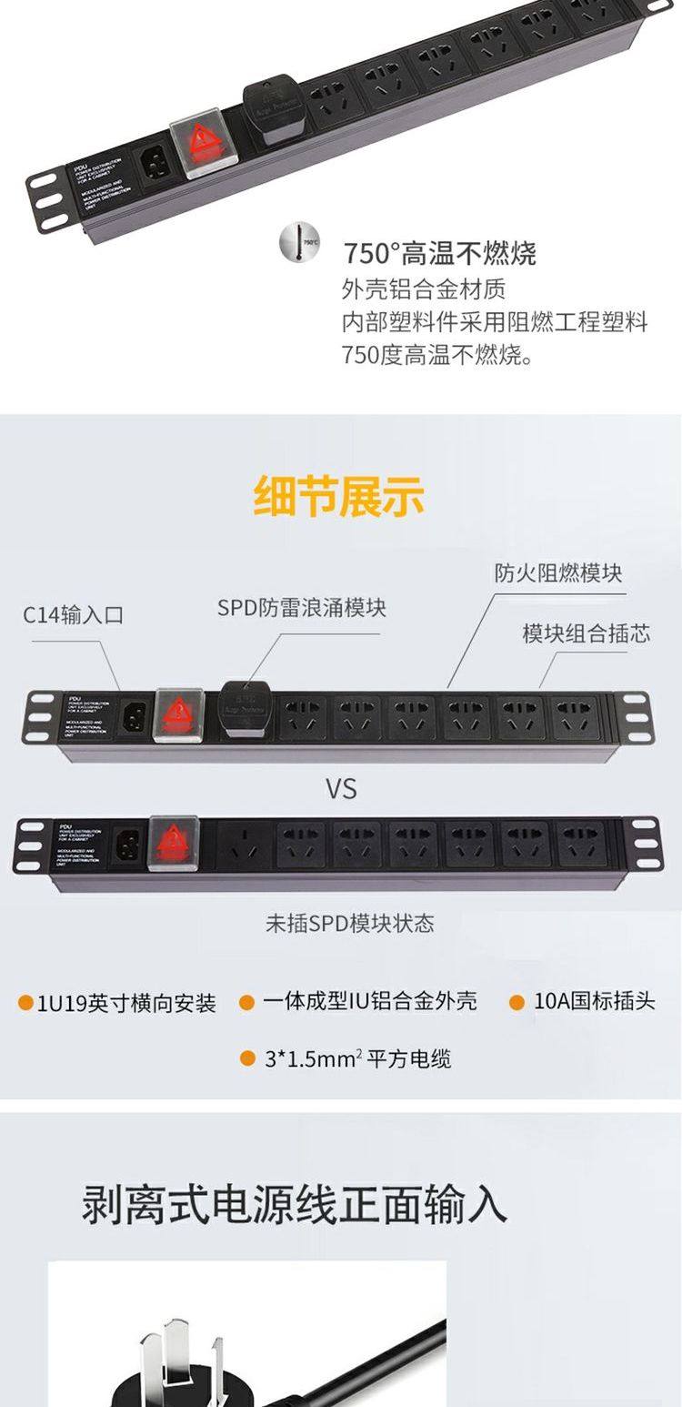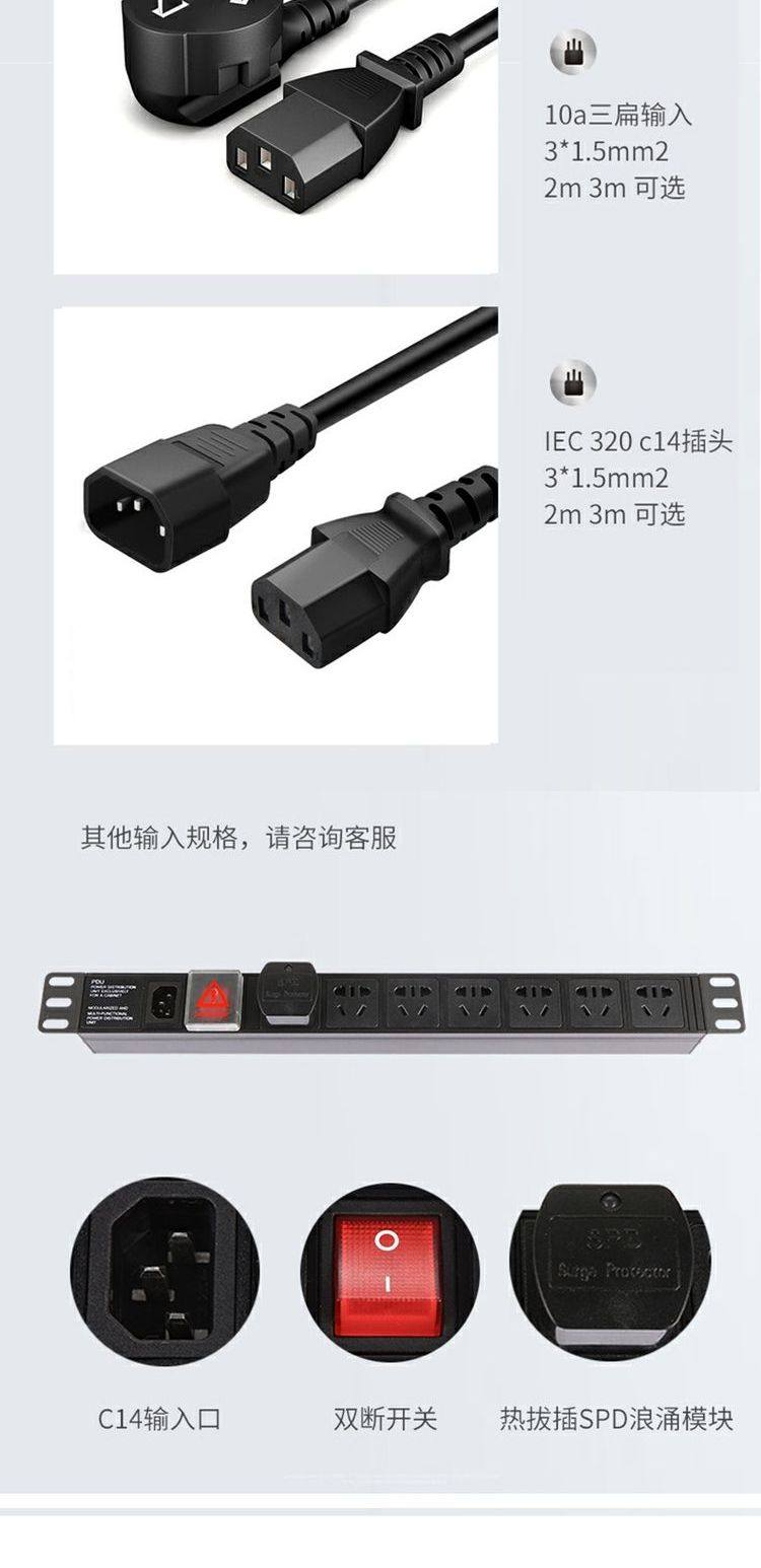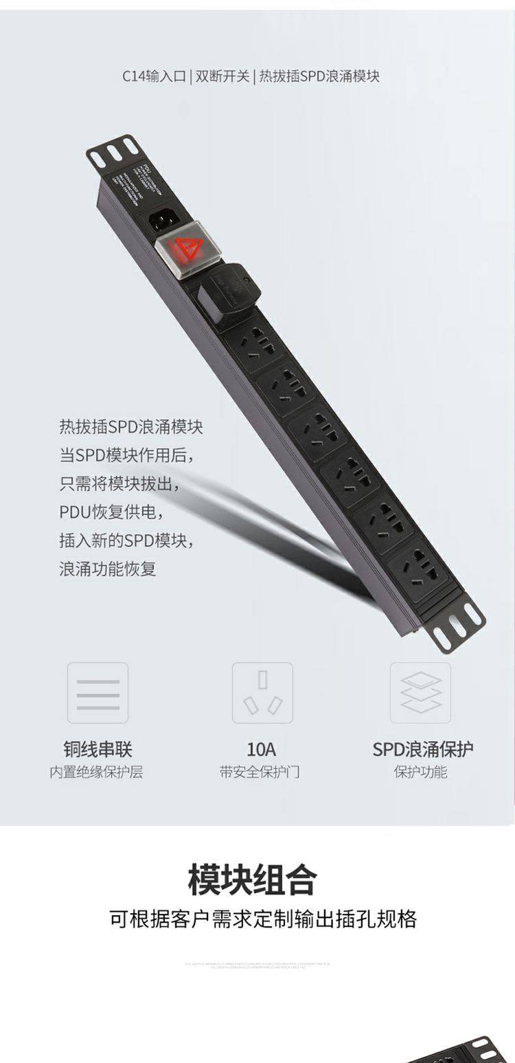PDU机柜电源插座1U19英寸6位10A带双断开关热拔插SPD浪涌模块排插