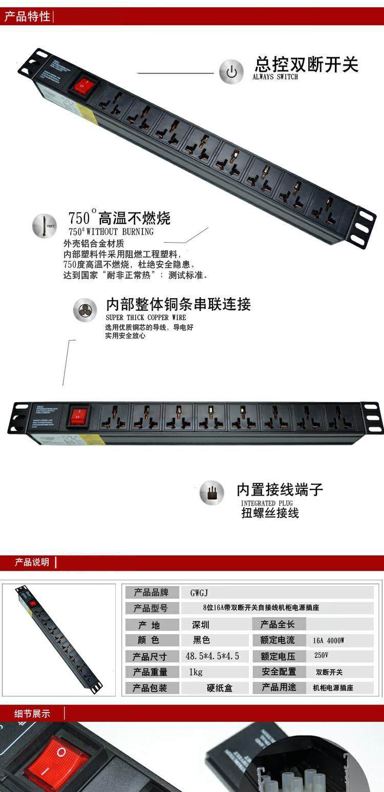 PDU机柜电源插座13A1U19英寸8位铝合金排插接线板排插