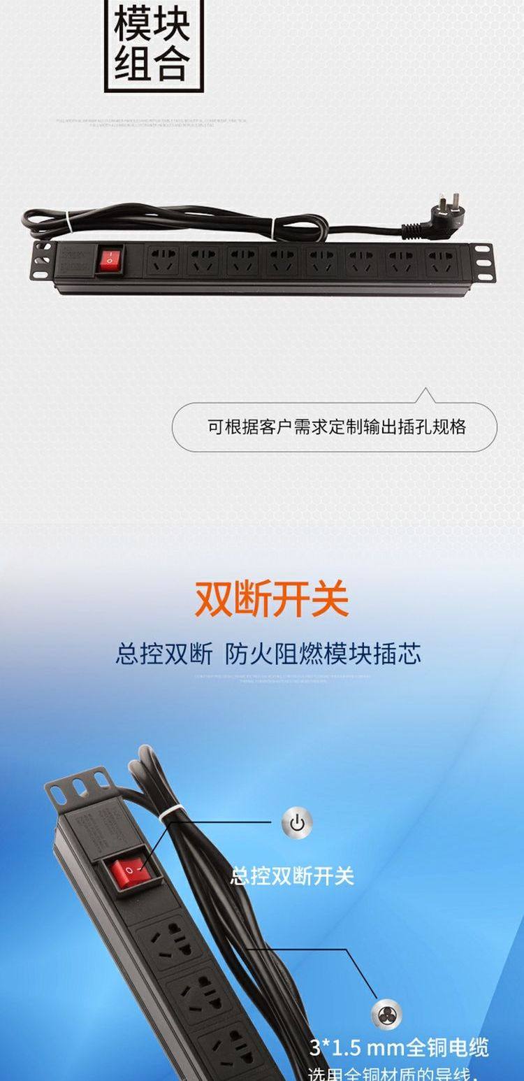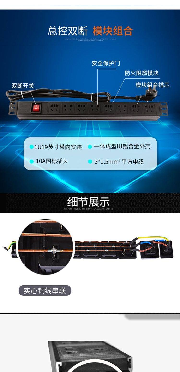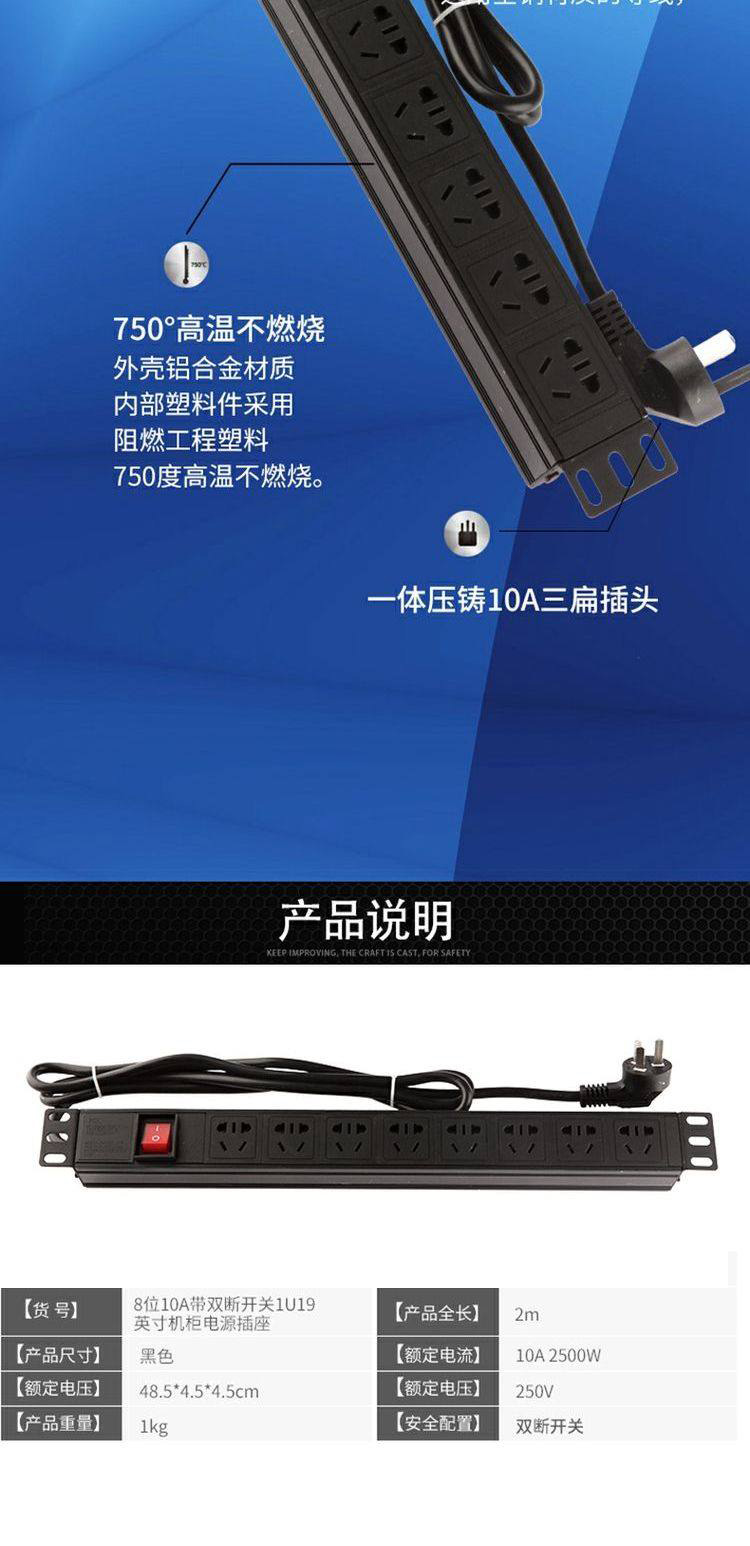 PDU机柜电源插座1U19英寸8位10A带双断开关铝合金排插接线板
