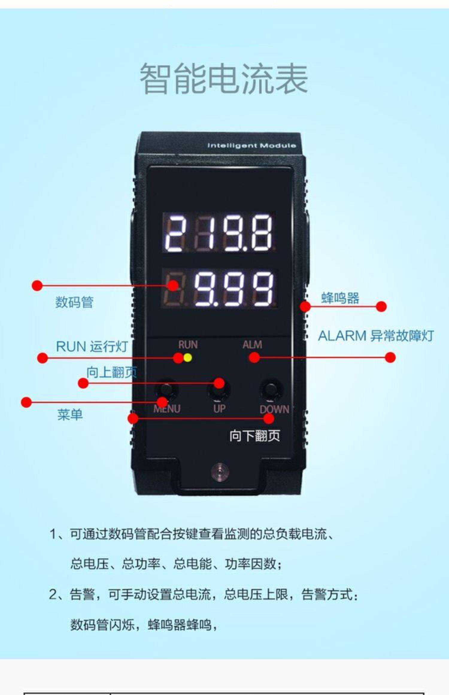 1、可通过数码管配合按键查看监测的总负载电流、总电压、总功率、总电能、功率因数;