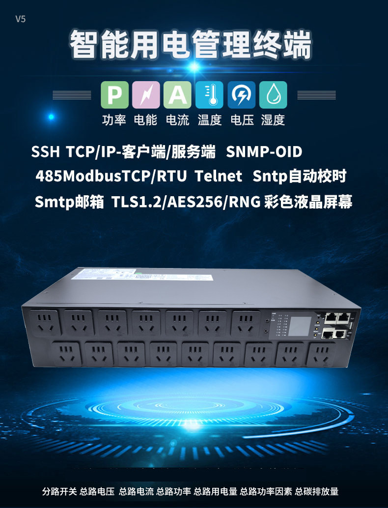 1、SSH TCP/IP-客户端/服务端 SNMP-OID485ModbusTCP/RTU Telnet Sntp自动校时Smtp邮箱 TLS1.2/AES256/RNG 彩色液晶屏幕