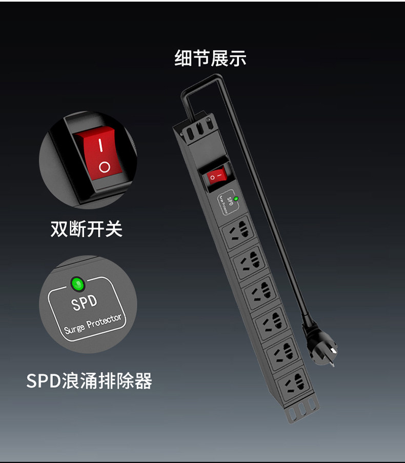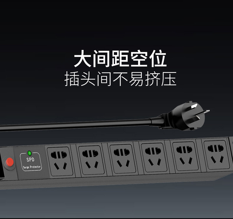 PDU机柜电源插座10A6位防雷带双断开关1U19英寸铝合金排插接线板