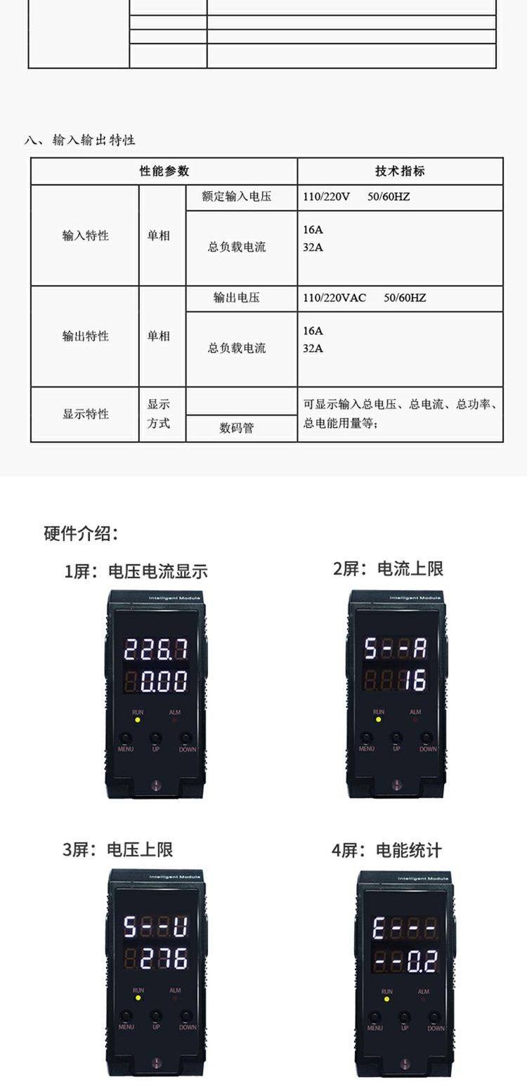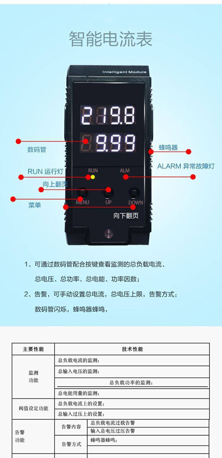 1、可通过数码管配合按键查看监测的总负载电流,总电压、总功率、总电能、功率因数;