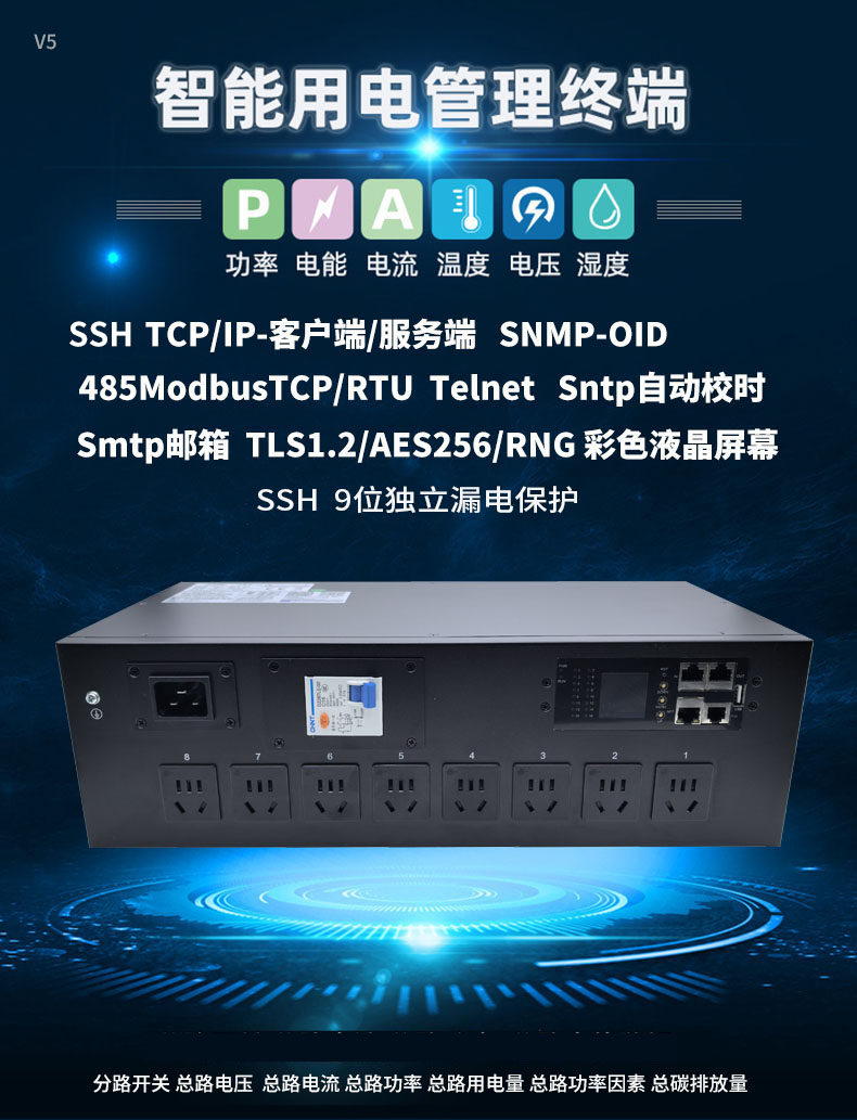 1、SSH TCP/IP-客户端/服务端 SNMP-OID485ModbusTCP/RTU Telnet Sntp自动校时Smtp邮箱 TLS1.2/AES256/RNG 彩色液晶屏幕SSH 9位独立漏电保护