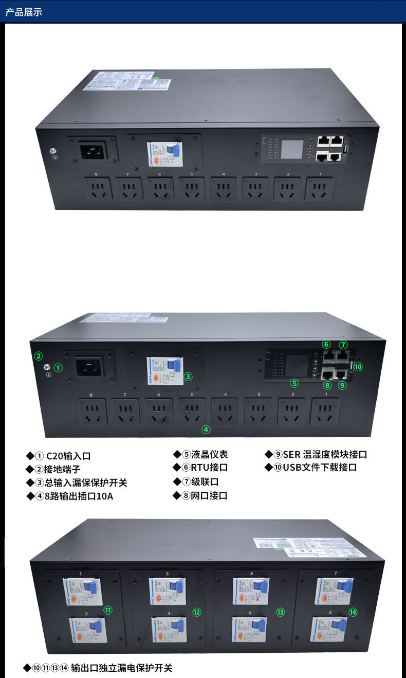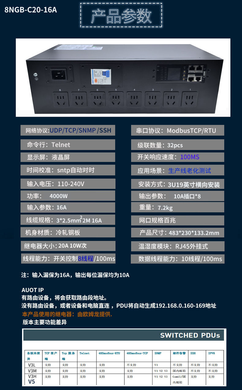 智能PDU插座远程监控开关漏电保护snmpSSH Telnet协议8路10A输出
