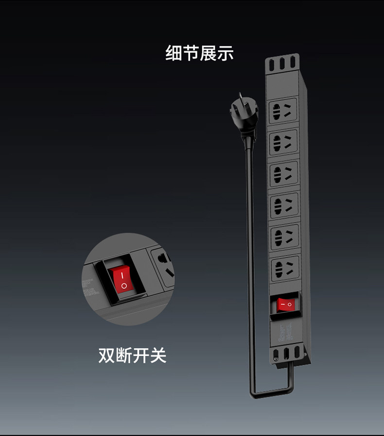 PDU机柜电源插座10A6位防雷带双断开关1U19英寸铝合金排插接线板