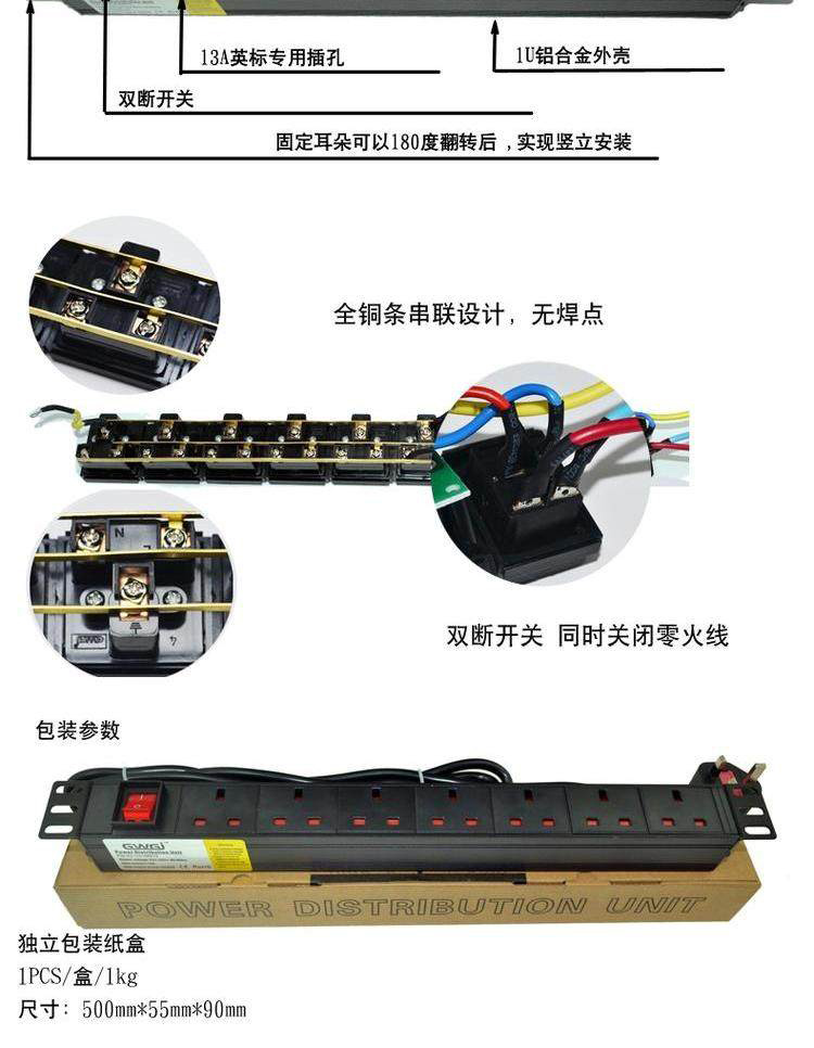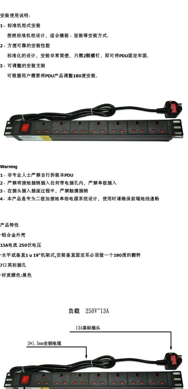 PDU机柜电源插座英规英标13A带双断开关铝合金7位排插接线板