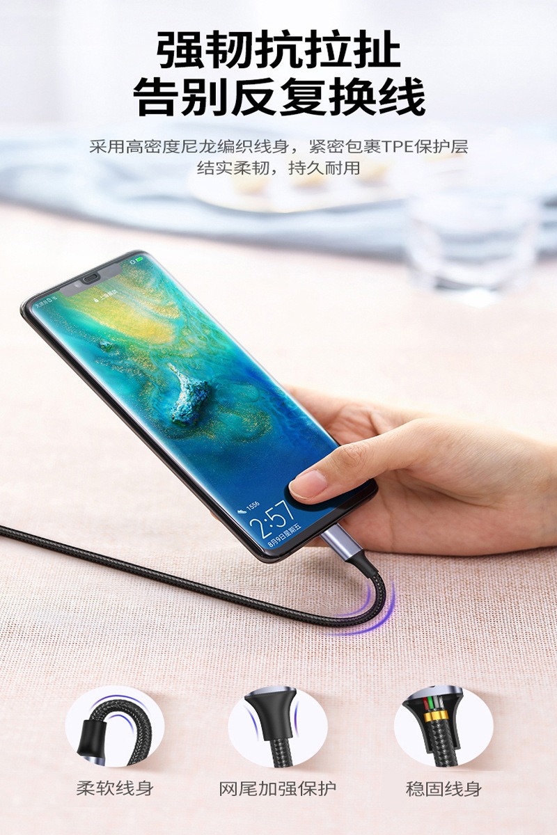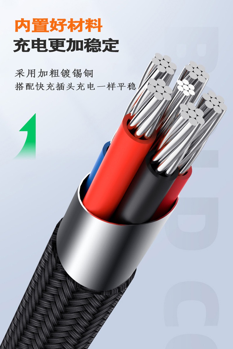 1、采用环保尼龙编织外被,手感极佳,162根国标铜线,电流可达到6A,极速充电,每条出厂前我们均半成品测试一次成品测试一次,保证将不良率降至微零,外观新颖,线材柔软、耐用、不易打结,手感细腻、有质感,铜线芯高速传输,充电传输稳定不间断。