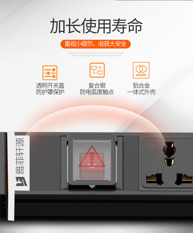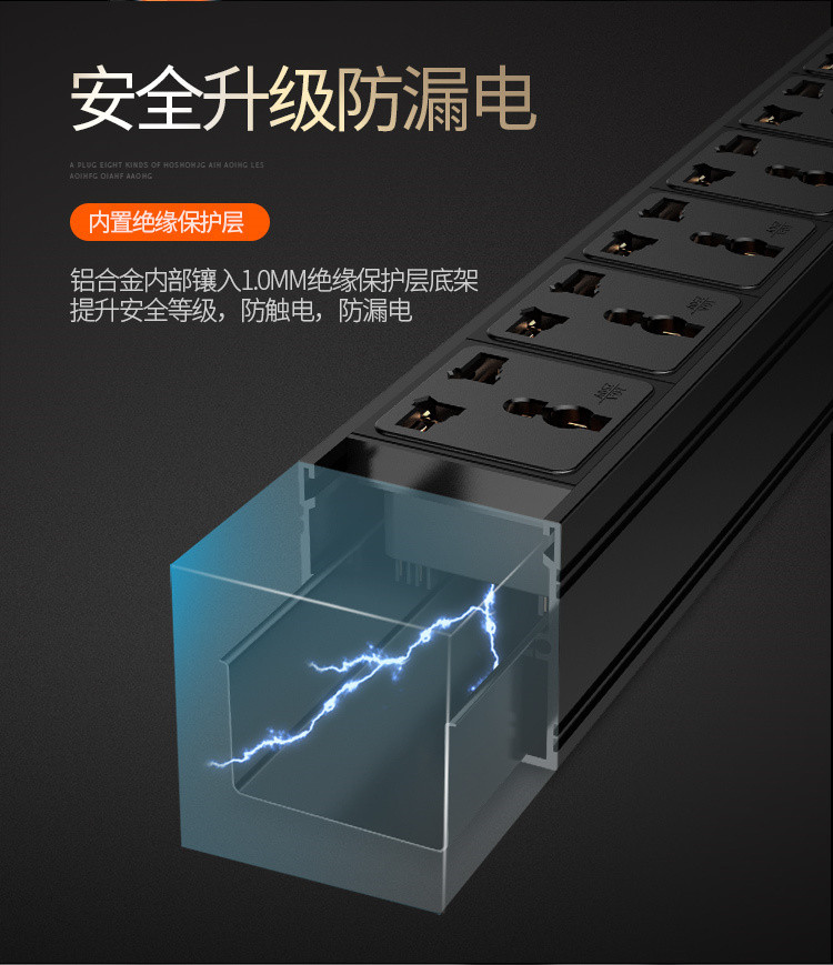 3、铝合金内部镶入1.0mm绝缘保护层底架,提升安全等级,增加爬电距离,防触电;